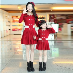 春秋季百褶韩版长袖亲子装母女连衣裙双排扣