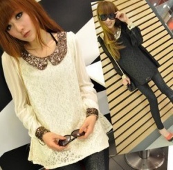 春装蕾丝衫 娃娃领 韩版女装宽松亮片长袖打底衫雪纺衫